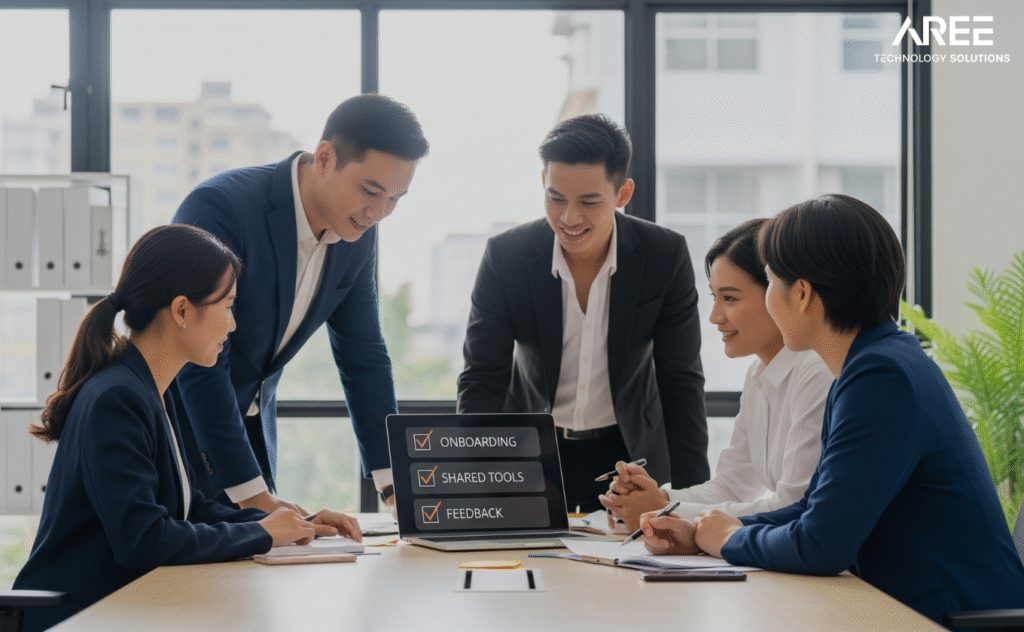 การมองพนักงานเอาท์ซอสเป็นส่วนหนึ่งของทีมไม่ได้เป็นเพียงเรื่องของความรู้สึก แต่เป็นกลยุทธ์ที่จับต้องได้ เมื่อองค์กรปฏิบัติกับพวกเขาเหมือนเป็นทีมเดียวกัน บรรยากาศของความไว้วางใจจะเกิดขึ้น พวกเขาจะรู้สึกมีส่วนร่วมและทุ่มเทให้กับความสำเร็จของโปรเจกต์อย่างเต็มที่ เปรียบเสมือนตัวเองเป็นส่วนหนึ่งขององค์กร การทำเช่นนี้เริ่มต้นได้ง่ายๆ ด้วยการเชิญพวกเขาเข้าร่วมการประชุมทีมทั้งหมด แบ่งปันข้อมูลและเป้าหมายของโปรเจกต์อย่างเต็มที่และโปร่งใส ที่สำคัญคือการรับฟังความคิดเห็นของพวกเขาอย่างเท่าเทียม เพราะมุมมองจากคนนอกอาจนำมาซึ่งไอเดียใหม่ๆ ที่ทีมภายในอาจมองข้ามไป